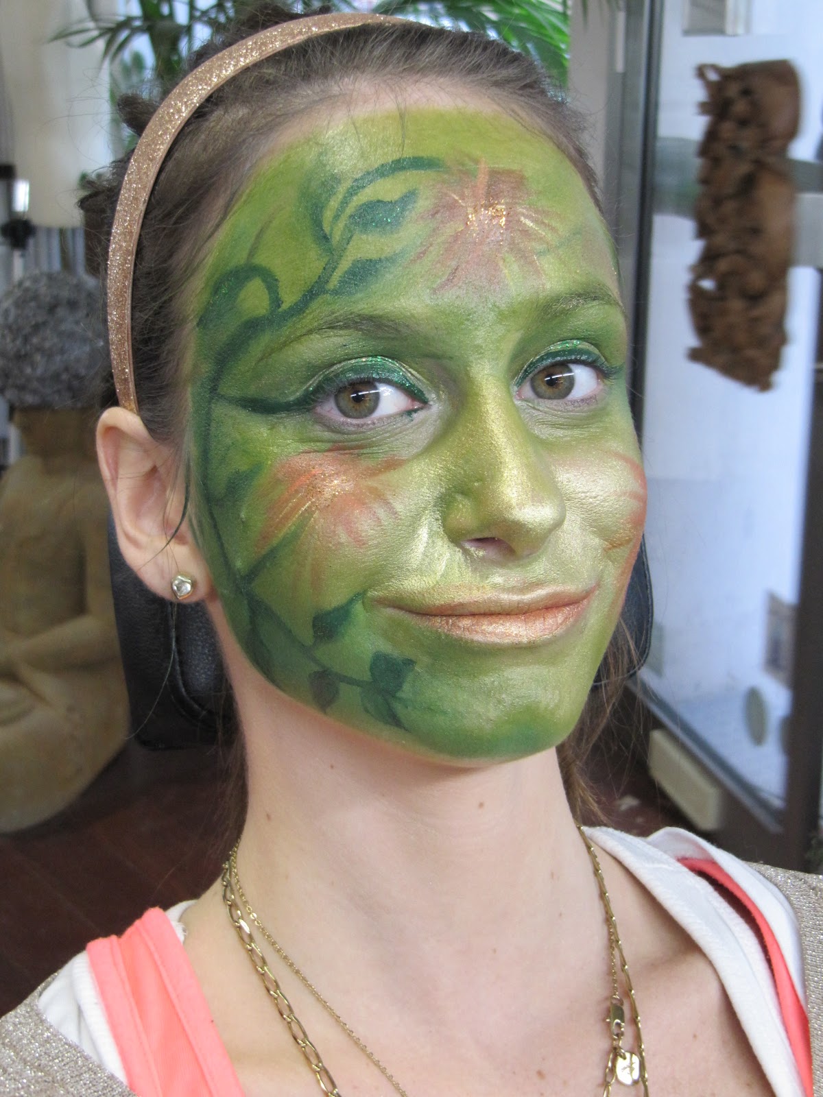My headdress is made of a fabric swimming cap, sewn-on peacock feather, sequins and decorative stones. The water colors are from a Kryolan Aqua Color Palette .